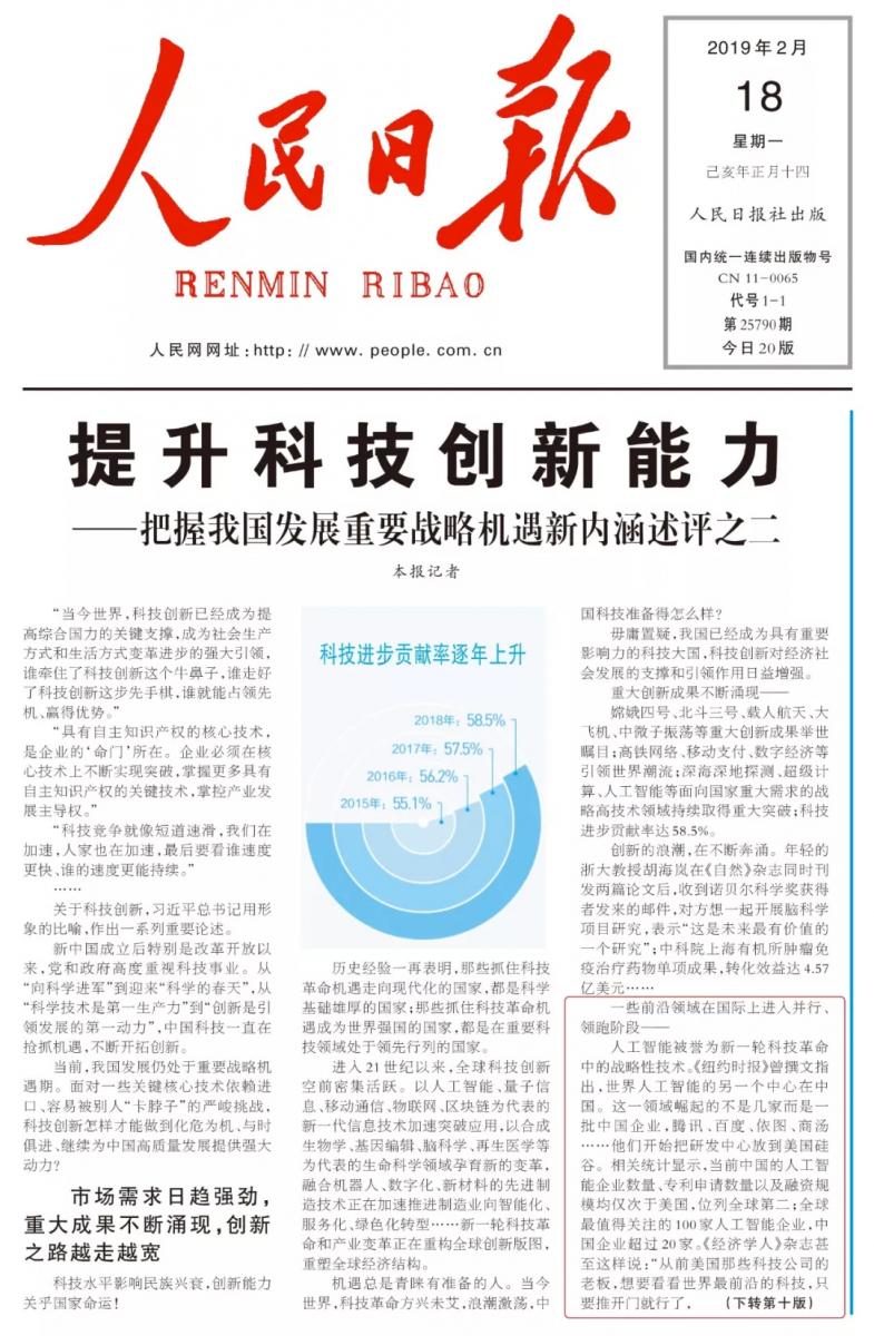 今天,《人民日報(bào)》頭版頭條發(fā)表題為《提升科技創(chuàng)新能力——把握我國發(fā)展重要戰(zhàn)略機(jī)遇新內(nèi)涵述評之二》的文章。文章認(rèn)為,我國已經(jīng)成為具有重要影響力的科技大國,在人工智能這一前沿領(lǐng)域,騰訊、百度、依圖等一批中國企業(yè)開始在國際上并行、領(lǐng)跑。