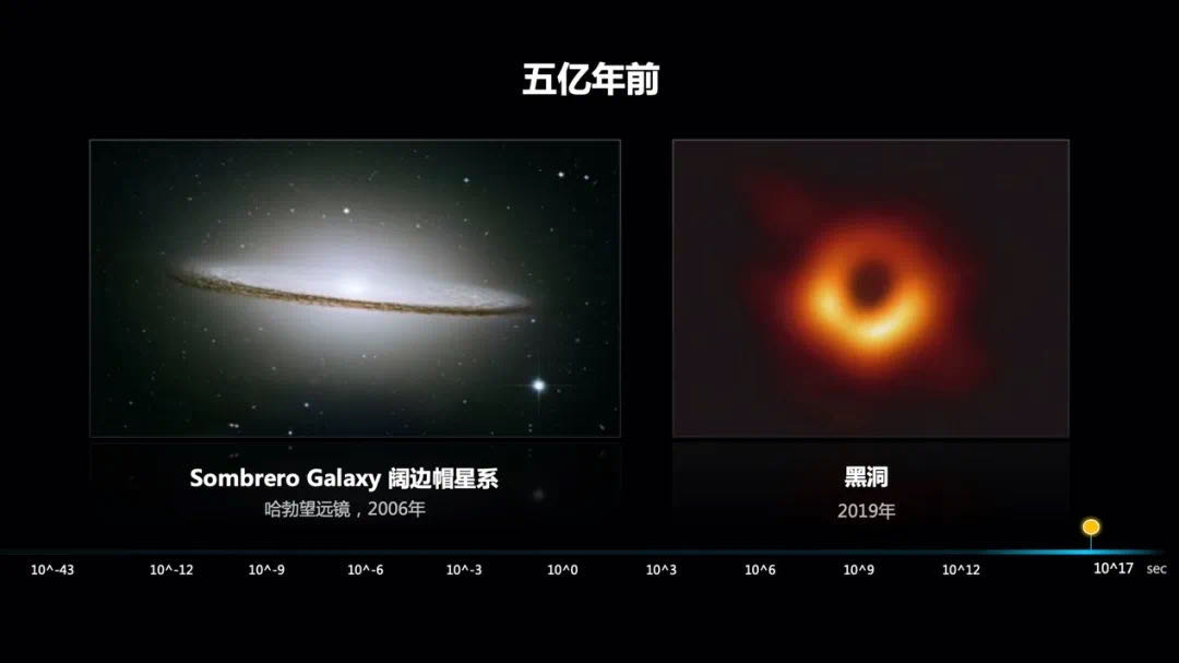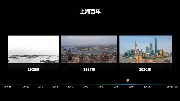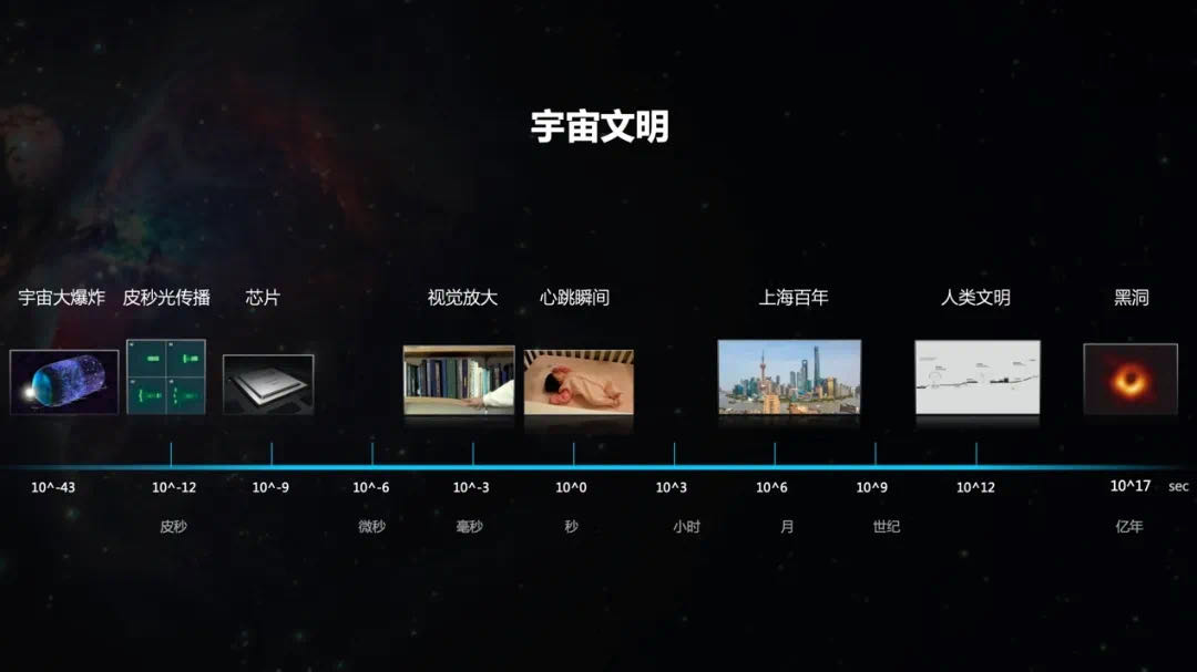 我們所知的宇宙中最小的時間是宇宙大爆炸的十的負四十三次方秒,從這個最小的時間單位,到人類心跳瞬間的1秒,再到城市的歷史,再到人類的歷史,再到更遙遠的人類試圖觀察距今幾億年前的銀河系的歷史,這是從時間軸和物理世界看宇宙文明的發展變遷。