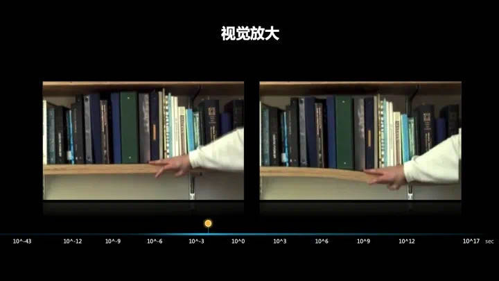 我們再看一秒尺度下物理世界的變遷。下面這組照片,左邊這張是正常拍攝下人眼看到的手撐住書架,右邊這張圖是用機器看到視頻當中不同頻率的信號捕捉出來微小的震動,把它放大100倍、1000倍之后,能夠看到木材是如何受力的,這在時間緯度上是非常細微的。