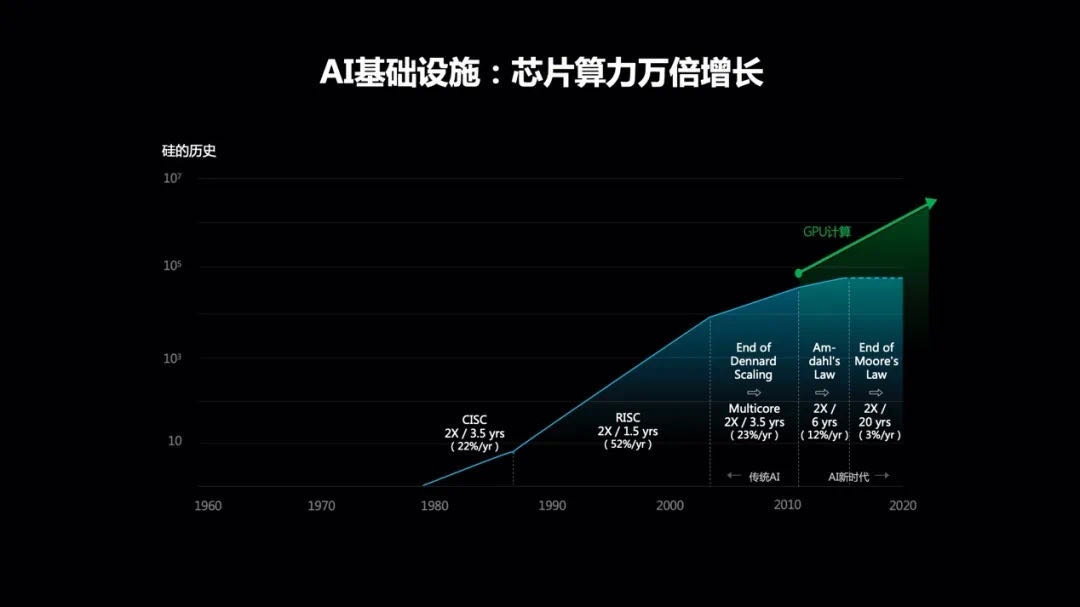 過去幾十年,算力發展分為兩個階段,一個是藍色這條曲線,一個是綠色這條曲線,我們分別把它叫做舊時代的或傳統時代的芯片,以及新時代的基于GPU 或為AI計算定制的芯片。藍色曲線基于傳統摩爾定律發展,性能每隔18--24個月提升一倍;綠色曲線是加速的超摩爾時代的芯片算力,過去幾年間,AI算力翻了接近一萬倍,單個GPU的算力比過去基于CPU的算力多了一千倍。