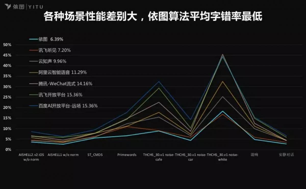 從技術性能來說,字錯率曲線抖動越小,算法的場景通用性越好。綜合各場景測試的結果,業界主流算法中,依圖和訊飛的算法字錯率抖動相對較小。