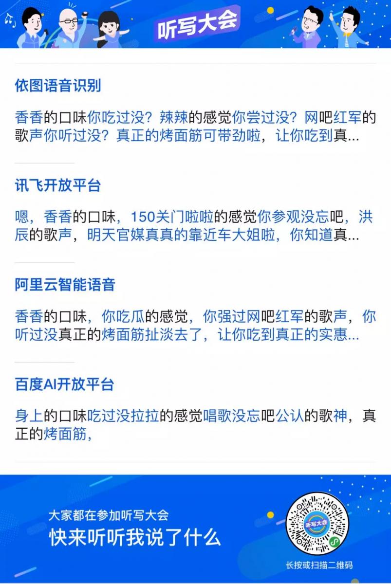 聽寫大會小程序一經發布,各種評(tiao)測(xi)洶涌而來。依圖語音憑借自身優秀的技術,展現了極其穩定的語音識別能力。
