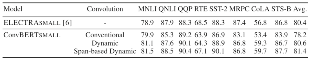 可以看出在模型大小一致的情況下,傳統卷積的效果明顯弱于動態卷積。并且,本文提出的基于跨度的動態卷積也比普通的動態卷積擁有更好的性能。