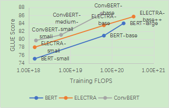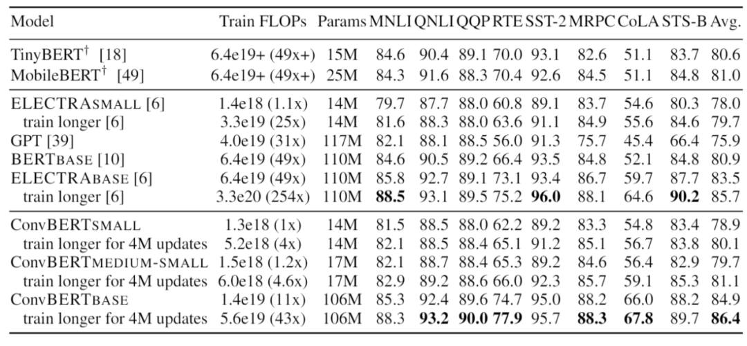 這一模型在節省了訓練時間和參數的情況下,在衡量模型語言理解能力的 GLUE benchmark 上相較于之前的 State-of-the-art 方法,如 BERT 和 ELECTRA,都取得了顯著的性能提升。其中 ConvBERT-base 模型利用比 ELECTRA-base 1/4 的訓練時間達到了 0.7 個點的平均 GLUE score 的提升。