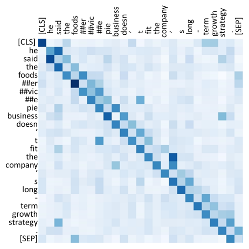 之前 BERT 這類模型主要通過引入自注意力機制來達到高性能,但是依圖團隊觀察到 BERT 模型中的 attention map 有著如下圖的分布(注:attention map 可以理解成詞與詞之間的關系),這表明了大多注意力主要集中在對角線,即主要學習到的是局部的注意力。這就意味著其中存在著冗余,也就是說很多 attention map 中遠距離關系值是沒有必要計算的。