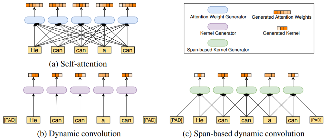 基于這一觀察,依圖提出了基于跨度的動態卷積,通過接收當前詞和前后的一些詞作為輸入,來產生卷積核進行動態卷積,這在減少了自注意力機制冗余的同時,也很好地考慮到了語境和對應卷積核的多樣性。
