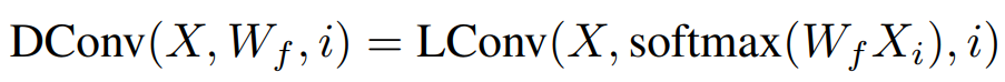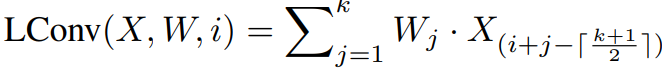 其中X∈R^n×d 為輸入的特征,而W∈R^k 則是卷積核,k 為卷積核的大小。輕量卷積的作用是將輸入的每個詞對應的特征附近的 k 個特征加權平均生成輸出。在此基礎上,之前提到的動態卷積可以寫作