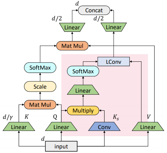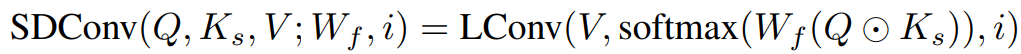 此處,輸入 X 先經過線性變換生成Q和V,同時經過卷積生成基于跨度的K_s,由Q⊙K_s經過線性變換以及 softmax 來產生卷積核與V進一步做輕量卷積,從而得到最終的輸出。