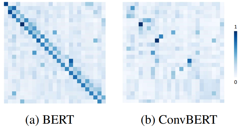 從下圖 BERT 和 ConvBERT 中的自注意力模塊的 attention map 可視化圖對比也可以看出,不同于原始的集中在對角線上的 attention map,ConvBERT 的 attention map 不再過多關注局部的關系,而這也正是卷積模塊減少冗余的作用體現。