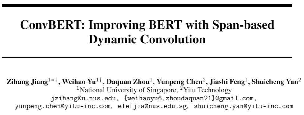 最近 BERT 這一類基于預訓練的語言理解模型十分流行,也有很多工作從改進預訓練任務或者利用知識蒸餾的方法優化模型的訓練,但是少有改進模型結構的工作。依圖研發團隊從模型結構本身的冗余出發,提出了一種基于跨度的動態卷積操作,并基于此提出了 ConvBERT 模型。